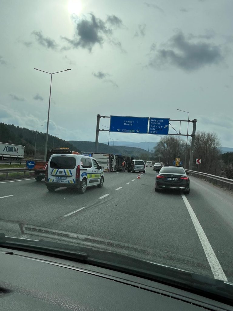 Kaza, Bilecik Bozüyük çevre yolunda meydana geldi. Edinilen bilgilere göre, Bursa İnegöl istikametinde, seyir halinde bulunan tır, sürücüsünün bir anlık direksiyon hakimiyetini kaybetmesi sonucu kontrolden çıkarak devrildi. İhbar üzerine olay yerine polis ekipleri sevk edilirken, bölgede güvenlik önlemleri alındı. Devrilen tır, olay yerine çağrılan üç vinç yardımıyla bulunduğu yerden kaldırıldı. Öte yandan, kaza nedeniyle bölgede trafik bir süre aksarken, çalışmaların tamamlanmasının ardından ulaşım normale döndü.